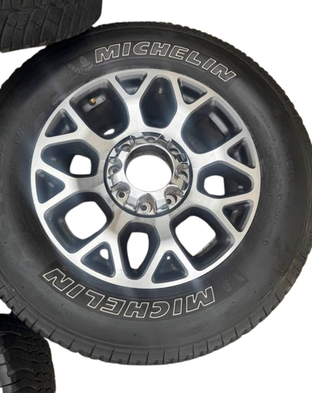 Stock 20″ OEM Lariat wheels and tires from a 2022 Ford F250. The wheels are in exceptional condition and feature an 8×170 bolt pattern. This set includes 4 center caps, lug nuts, and TPMS sensors. Mounted and balanced with Michelin 275/65R20 tires.